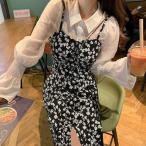 総柄キャミワンピ サイドスリット 低身長 aラインワンピース膝丈 四つ葉柄夏服 レイヤード 細見え ロングワンピース大人