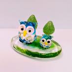 ふくろうと森の台ペア(L)青のガラス細工の置物です。