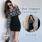 ☆チェック柄シャツとハイウエストミニスカートが一体となったタイトシルエットのドッキングワンピース