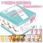 7年保存クッキー×3(チーズ・パンプキン・ココナッツ×各1)、7年保存レトルトパン×3(ミルクブレッド・チョコレート、ブルーベリー×各1)、7年保存レトルト食品×3(カレーピラフ、コーンピラフ、五目ごはん×各1)、7年保存水500ml×3、スプーン×3