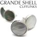 丸く型抜いた天然貝を使用したシンプルなカフス。台には斜めに溝を彫ることで装飾を施し、シンプルかつスタイリッシュに仕上げられています。