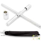 十字レンチ、T型レンチの二つの使い方のできる便利なクロスレンチです分解式で場所を取らず収納可能です17mm/19mmと21mm/23mm のソケットが付属し、あらゆる車種に対応差込角 1/2収納袋付き