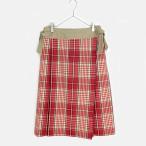 【コメント】 赤系チェック柄のボックスプリーツスカートです。ラップデザインでウエストには両サイドリボンがあります。気になる汚れはなく綺麗ですが、ウエストにハンガー跡と錆のようなものがあります。