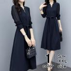 ワンピース Aライン 無地 長袖 M L XL 2XL ネイビー