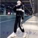 おしゃれなロングスリープトップスとライン入りパンツのスポーティスタイル?