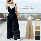 オールインワン ツイル ウエスト リボン ストラップ オーバーオール チノパン らくちん ブラック ベージュ カーキ 黒 茶 ワイド ワイドパンツ ワイパン 胸当て 肩紐 つなぎ 綿100% コットン 綿