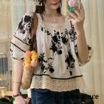 トップス シャツ ブラウス 花柄ブラウス ボタニカル柄 レースブラウス 切り替え Uネック レディス レディース 夏 新作 2022