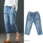 ジーンズ レディース 刺繍 花 フラワー イージーパンツ 七分丈 クロップド デニムパンツ ウォッシュ ダメージ