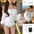 水着 チュール袖 胸元リボン フリル プール水着 オフショルダー バックレースアップ リゾート サマー海