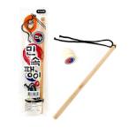 回したコマを棒に付けた紐でたたいて、回して遊びます。