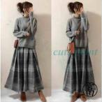ニット トップス セットアップ ハイネック レディース ロングスカート チェック柄 秋 長袖 体型カバー 秋冬 可愛い 通勤 OL