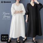 ★☆ワンピース 長袖 無地 薄手 ワイドワンピ 大きいサイズ レディース ロング Vネック リネン 春 夏 秋 ブラック ホワイト☆★