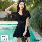 ★☆大きいサイズ 水着 レディース ワンピース 二の腕カバー シアー 黒 リボン M L LL 3L 4L ブラック 新入荷 メール便不可☆★