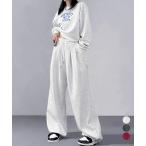 カレッジロゴが目を惹くスウェットトップスとワイドパンツのレディースセットアップ。