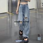韓国ハイウエスト カジュアル ストレートジーンズ クラッシュデニムパンツ ウォッシュ加工 ストリート ジーパン おしゃれ