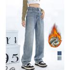 レディース ハイウエスト セミワイドパンツ 韓国風 ウォッシュ加工デニム あったか ジーパン 美脚脚長カジュアルボトムス