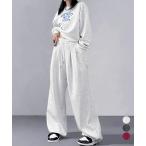 レディース ロゴプリントスウェットトップス 大人可愛いロゴトレーナー ウエストゴムワイドパンツ ポケット付イージーパンツ