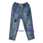 ジーンズ 刺繍 猫 魚 花 フラワー クロップド デニムパンツ イージーパンツ 七分丈 ウォッシュ ダメージ レディース