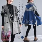 ニットカーディガン 半袖 エスニック柄 レディース カーディガン フード付 カーデ ノーボタン ロングパーカー ニット コート アウター 春秋 コーディガン ゆったり 体型カバー レトロ フード付きカーディガン ニットコーディガン グレー ブルー