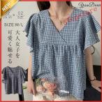 シャツ ブラウス レディース 春 夏 フレア ラッフルスリーブ フリル ブラウス チェック柄 半袖 おしゃれ ゆったり 可愛い 着痩せ体型カバーきれいめ 30代