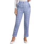 チェック柄、伸縮性ウエスト、スラントポケット、ジッパー留め、ストレートロングパンツ。