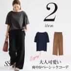 商品名:コーデ レディース 夏 Tシャツ フリル袖 カットソー ワイドパンツ 2点 セット リネン レーヨン シルケット ボトムス ロング丈 楽ちん M L 30代 40代 50代