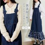 ジャンパースカート デニム 秋冬 レディース ロングワンピース 綿 デニム サロペットスカート フレアワンピース 異素材 切替 裾デザイン 無地 ゆったり 体型カバー 着?せ 大人可愛い 森ガール カジュアル お洒落 きれいめ 送料無料