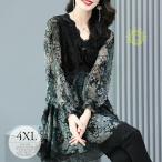 ブラウス シャツ Tシャツ 長袖 チュニック ス レディース 大きいサイズ Vネック シアー 透け感 レース レトロ フリル ベロア 異素材 ドッキング モード クラシック 大人可愛い 華やか パーティー 花柄 ブラック ミセス/[cso80]