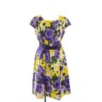 銀座マギー MAGGY フレアワンピース ひざ丈 クルーネック 半袖 リボン ベルト 花柄 38 マルチカラー /BB レディース