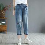 ジーンズ おしゃれ 刺繍 花 フラワー クロップド デニムパンツ イージーパンツ 七分丈 ウォッシュ レディース