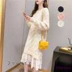 レディース 秋冬長袖 ニット無地ワンピース ミディアムスカート セーター ケーブル編み ニットレースパッチワーク 長袖 ニット ゆったり