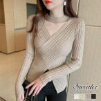 レディース ニット セーター クロスニット 長袖 リブニット Vネック トップス Free 無地 スリムニット プルオーバー すっきり 着痩せ フェミニン きれめ フィット 大人 上品 春 韓国 韓国ファッション 20代 30代 40代 50代 cocomomo
