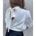 キーワード:ブラウス シャツ レディース ノーカラー リボン 長袖 無地