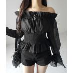 商品名:【 2color / 2WAY 】ウエストシャーリングシアーフリルオフショルブラウス / waist shirring sheer frill off shoulder blouse