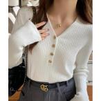 商品名:Vネックリブニットトップス マンテルボタン ハーフボタン オフィスカジュアル きれいめカジュアル レディース