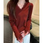 キーワード:ニット セーター レディース vネック レース 長袖 無地 フェミニン 韓国ファッション 大人カジュアル