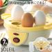 電気ゆで卵器。<br>半熟も固ゆでたまごも簡単にできます。<br>卵の個数、固さに合わせて付属の計量カップで水を測ります。<br>きれいに仕上げるため、計量カップの底面についている針で卵の底に1か所穴をあけます。<br>ゆであがるとブザーでお知らせします。<br>最大7個まで茹でられます。<br><br>■商品サイ...