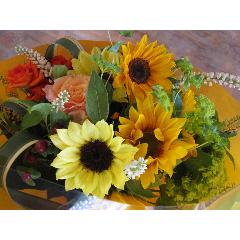 季節のイエロー~オレンジ系の花材を用いた明るい花束です。