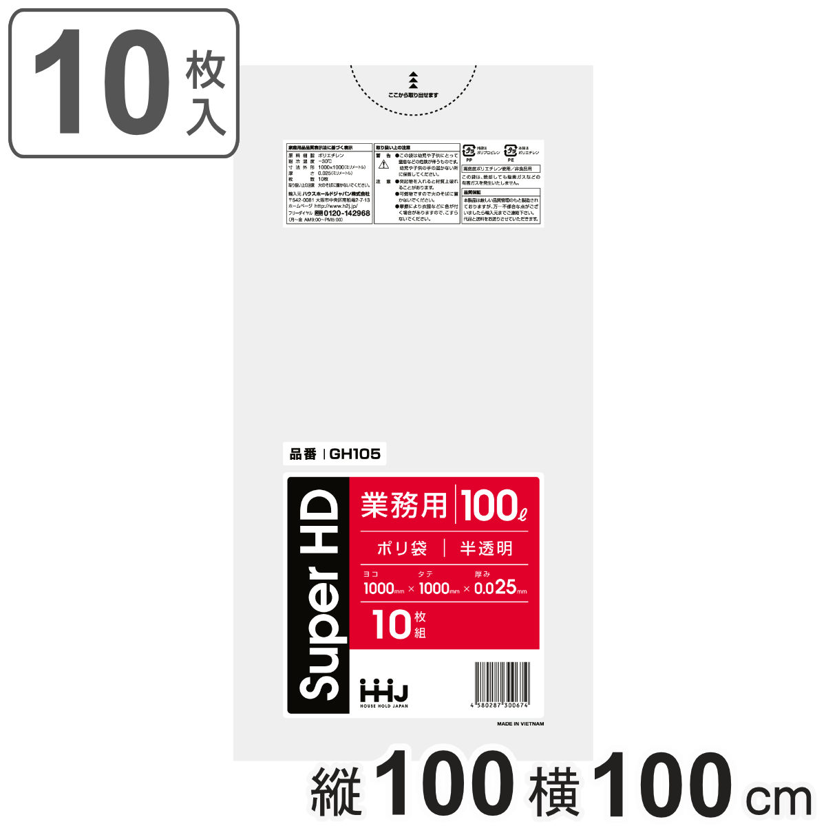 サイズ/約横100×縦100cm<br>厚さ:0.025mm<br>容量/約100L<br>内容量/10枚<br>材質/HDPE(高密度ポリエチレン)<br>生産国/ベトナム製<br>耐冷温度/-30度<br><br>●レジ袋のように、カサカサした感触が特徴の半透明のゴミ袋です。<br>●一...