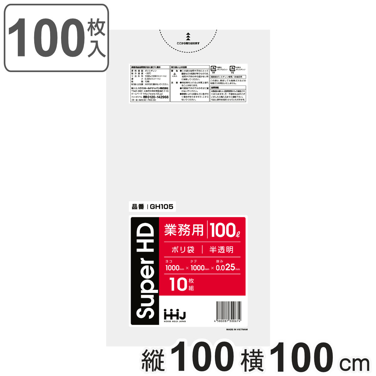 サイズ/約横100×縦100cm<br>厚さ:0.025mm<br>容量/約100L<br>内容量/100枚(10枚入り×10袋セット)<br>材質/HDPE(高密度ポリエチレン)<br>生産国/ベトナム製<br>耐冷温度/-30度<br><br>●レジ袋のように、カサカサした感触が特徴の半透明のゴミ袋...