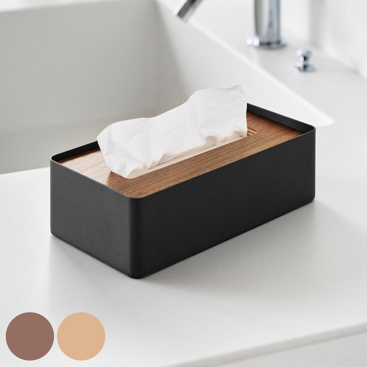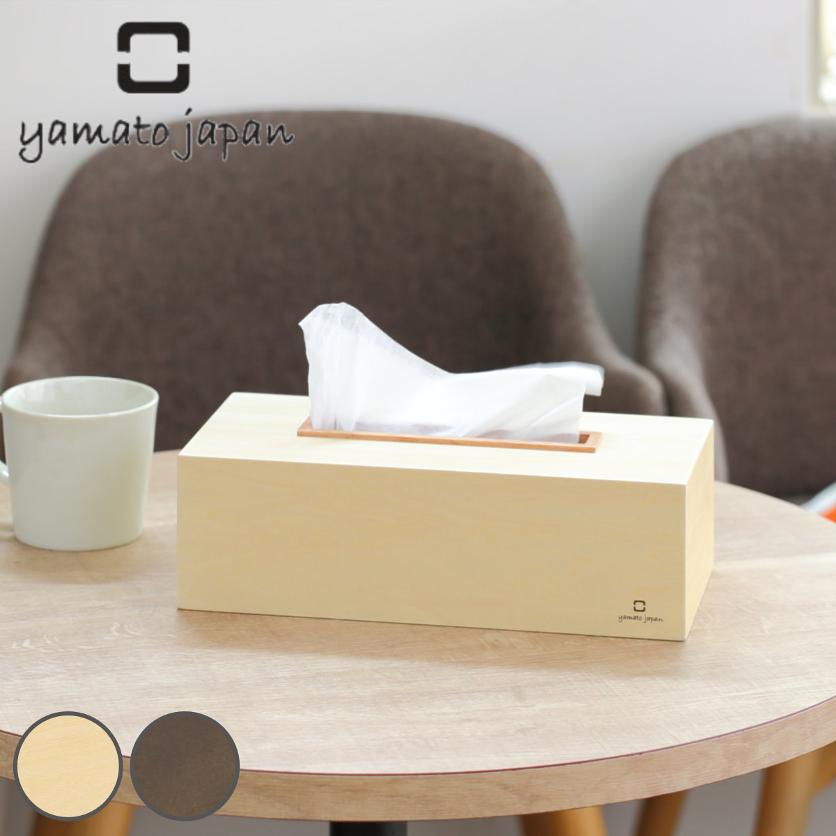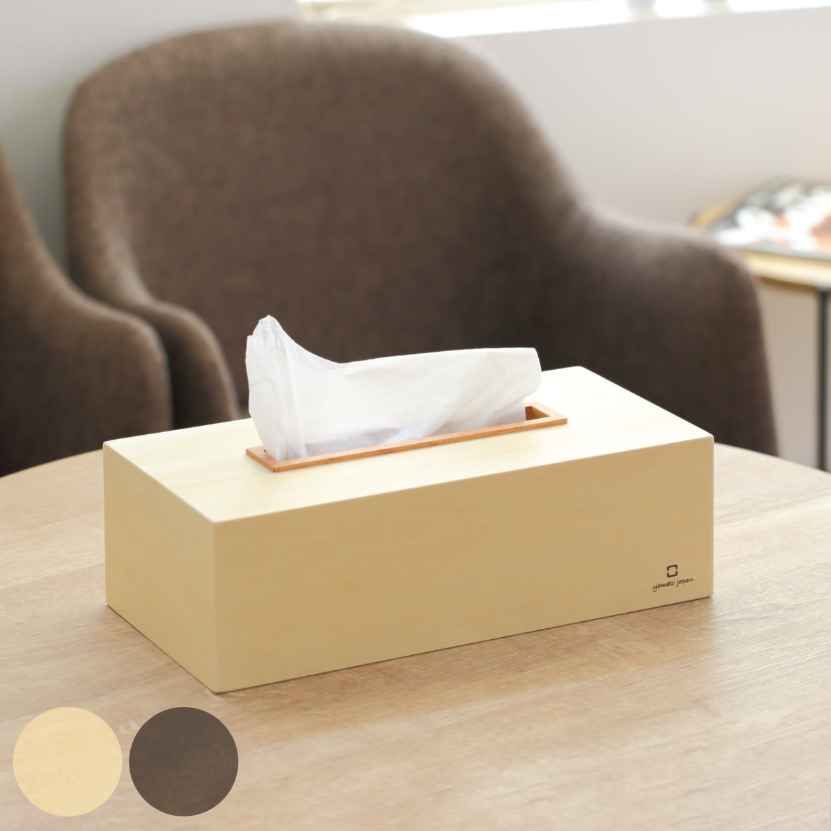 サイズ/外寸:約幅27.5×奥行13.3×高さ8.8cm<br>内寸:約幅26.3×奥行12.3×高さ7.1cm<br>内容量/1個<br>材質/シナ合板、天然木<br>種類/ナチュラル、ダークブラウン<br>生産国/日本製<br><br>●取り出し口の木口に天然木をあしらったシンプルなデザインのティッシュケースで...