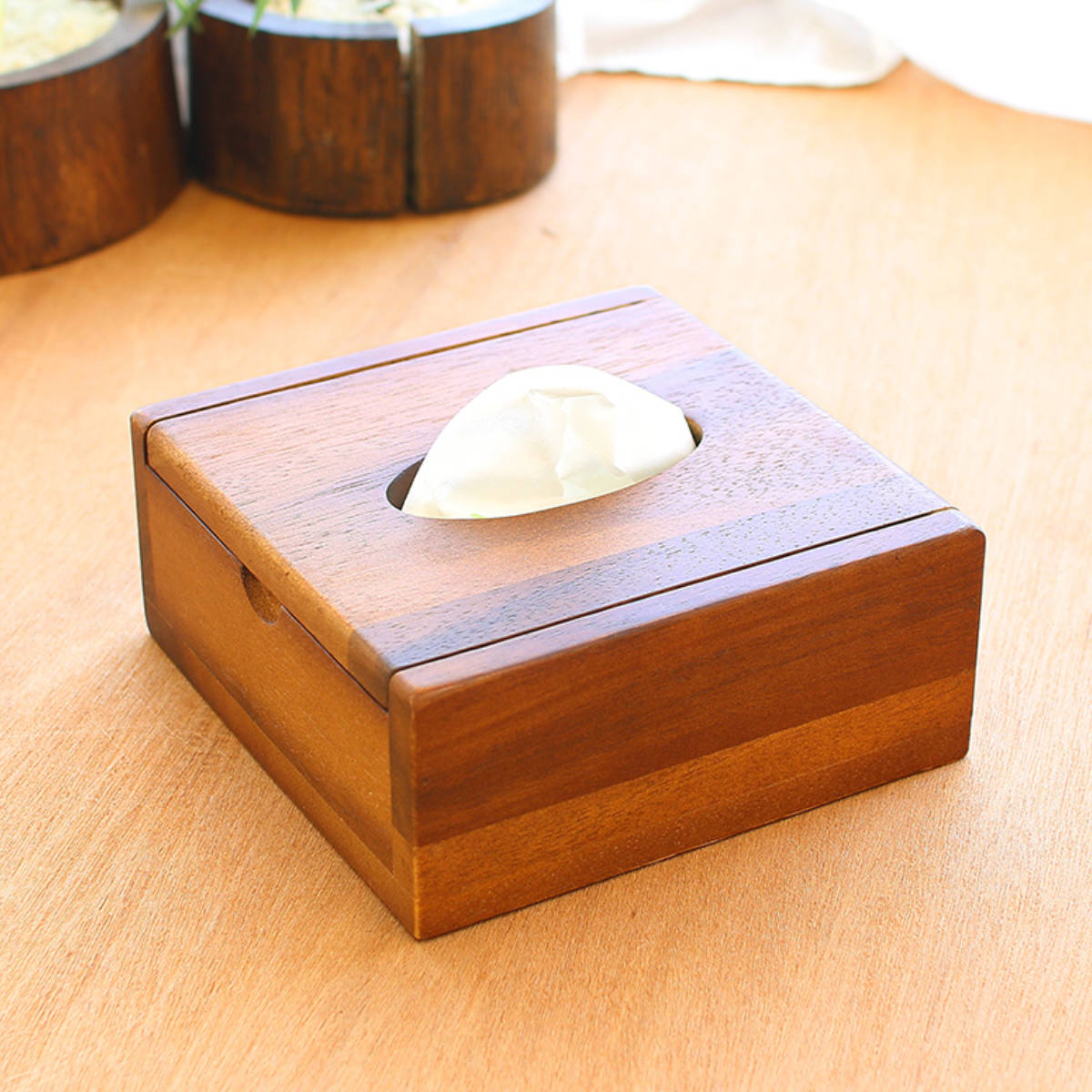 サイズ/約幅14×奥行14×高さ6cm<br>内容量/1個<br>材質/アカシア<br>生産国/タイ製<br><br>●アカシア無垢材の風合いが優しいハーフサイズのティッシュボックスです。<br>●ポケットティッシュサイズでテーブルの上に置くのにぴったりです。<br>●蓋は使いやすいフラップ式でティッシュの詰め替え...