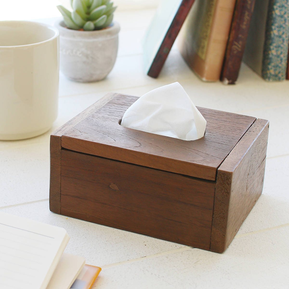 サイズ/約幅13×奥行10×高さ6cm<br>内容量/1個<br>材質/チーク材<br>生産国/タイ製<br><br>●チーク古材ならではの風合いが魅力のミニティッシュボックスです。<br>●ポケットティッシュサイズでテーブルの上に置くのにぴったりです。<br>●蓋は使いやすいフラップ式でティッシュの詰め替えも簡単...