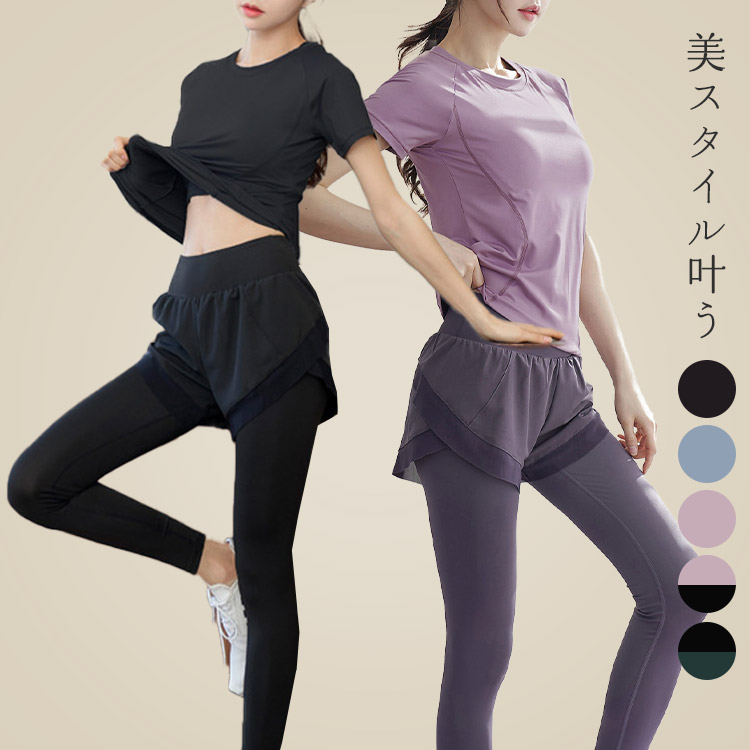 メール便送料無料 ヨガ ウェア レディース 半袖 トップス Tシャツ パンツ 2点セット ショートパンツ一体型 レギンス 上下 セットアップ スポーツウェア フィットネスウェア トレーニングウェア ピラティス 吸汗 速乾 バック メッシュ ラウンドヘム ハイウエスト 体型隠し 伸縮性 薄手 無地 黒<br><br>■セット内容<br>・2点セット<br&g...