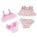 対象年齢:3歳以上<br>セット内容:タンクトップ、キャミソール、パンツ2枚※お人形はセットに含まれません。<br>お風呂の後やおねんねの前に下着を替えてあげる<br>いちごとハートをちりばめたデザインの、タンクトップとパンツのセット<br>キャミソールは、ピンク色を基調としたボーダー柄にレースを配したデザイン