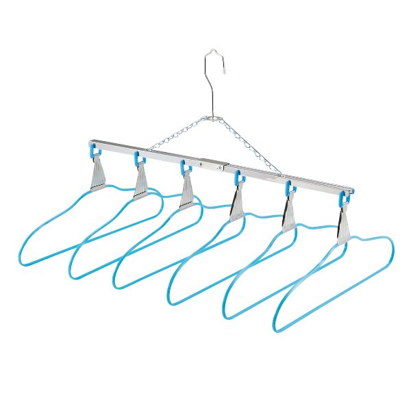 折りたたみ式の6連ハンガーです。一度に6枚のシャツが掛けられるので、物干し竿のスペースを節約できます。フレームの部分が中央で2つに折りたためるようになっているので、使わない時はコンパクトに収納できます。安心の日本製です。 【商品詳細】サイズ/約幅49.5×奥行37×高さ34cm 内容量/1本 材質/本体:ステンレス チェーン:鉄 ハンガー部分:ビニール被膜鉄綿 耐荷重/約1.5kg 生産国/日本製...